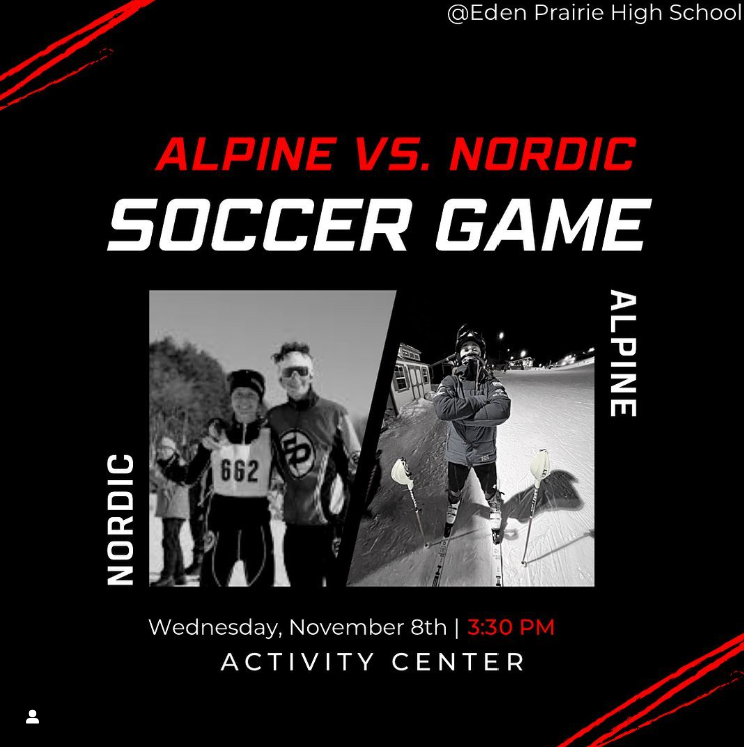 Captains' practices are being held from 3:45pm to 5:00pm on Mon 10/30, Wed 11/1, and Mon 11/6. Meet at on the grass fields by Lot B on the Northwest side of Eden Prairie High School. Wed 11/8 will be an Alpine vs. Nordic Soccer Game in the EPHS Activity Center (see announcement below).